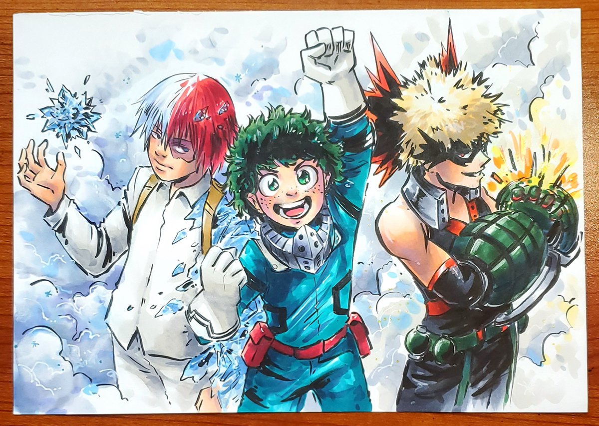 Copic marker original of Midoriya, Todoroki, and Bakugou from My Hero Academia. Image measures B5, aprox. 6.9 x 9.8 inches.