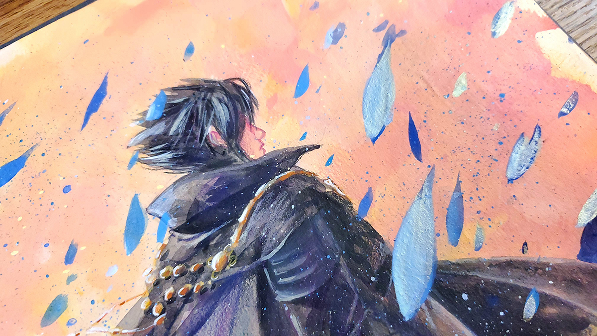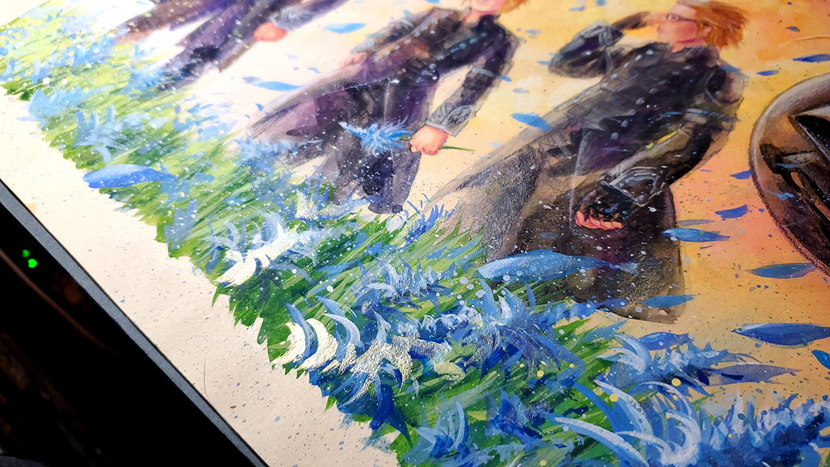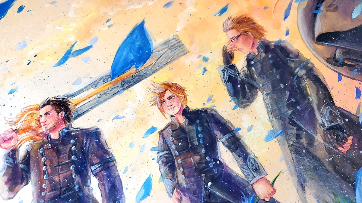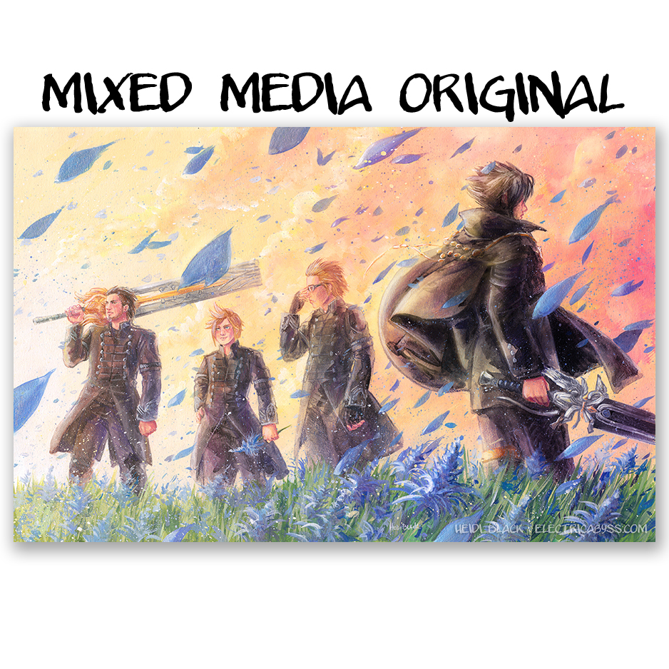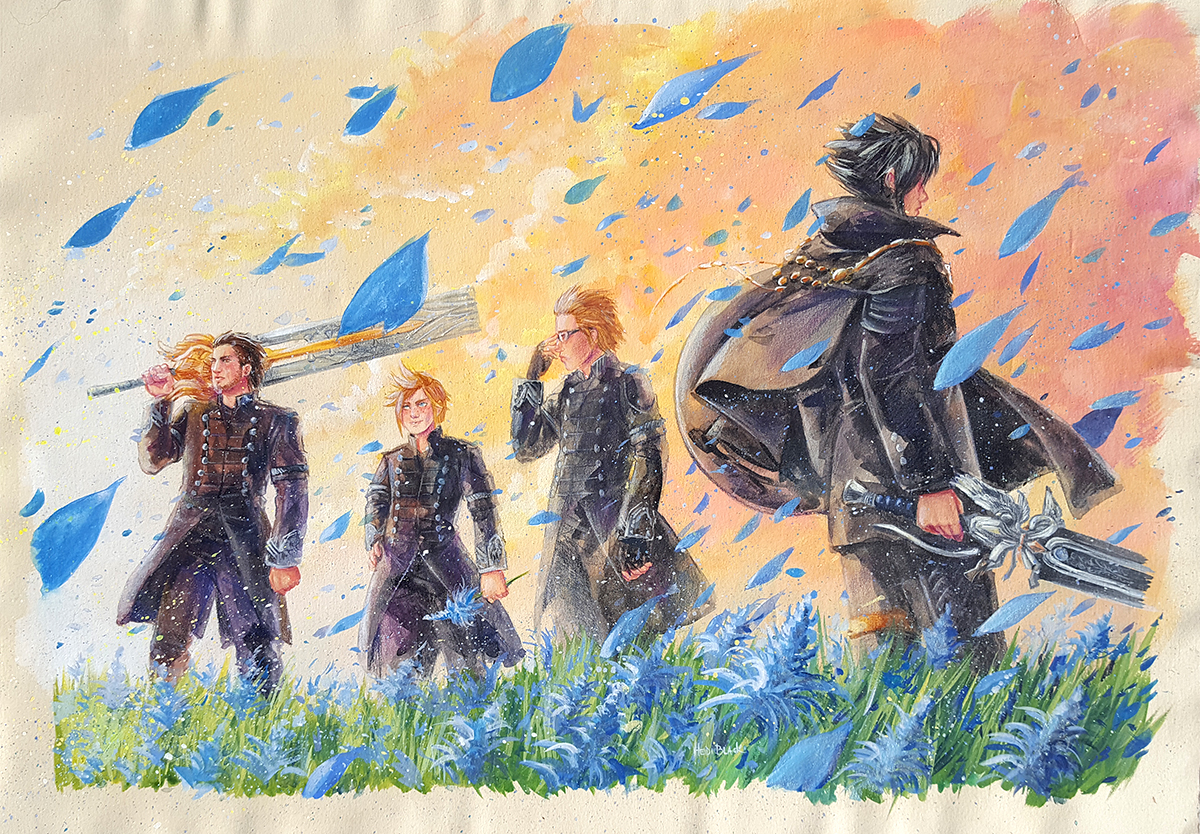 Gouache, watercolor, and colored pencil drawing on colored paper of the Final Fantasy XV protagonists. Original measures 13x19 inches and is done on canson colored paper mounted on board, with a frameable image area of 11x17 inches. Subtle shimmering highlights accent the flowers.