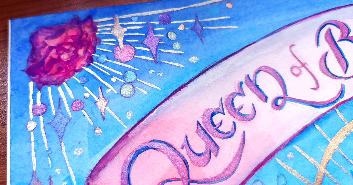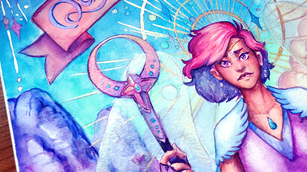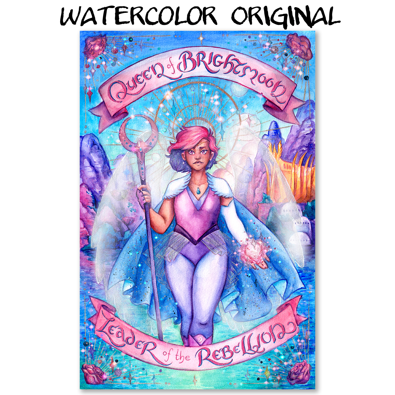 Watercolor original of Glimmer from Netflix's She-Ra. Measures 11x16 inches and features metallic, shimmering, and color-changing paints.