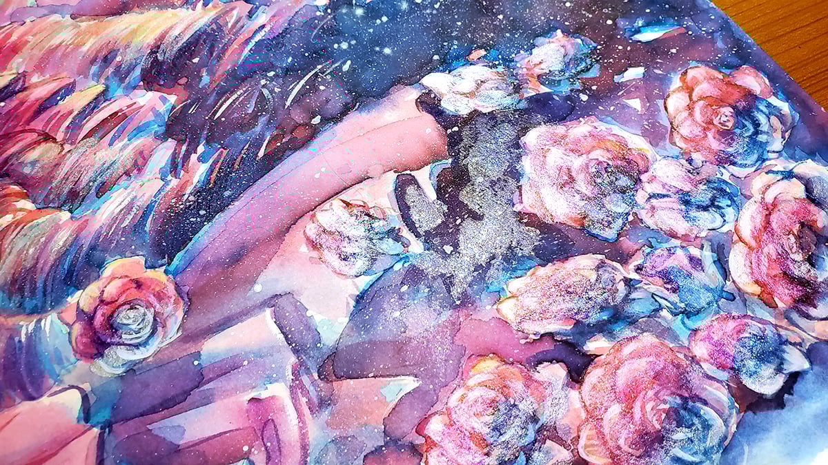 Watercolor painting of Rose Quartz from the show Steven Universe. Features glitter and shimmer highlights and measures 12x16 inches