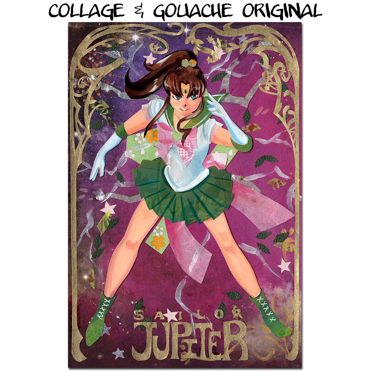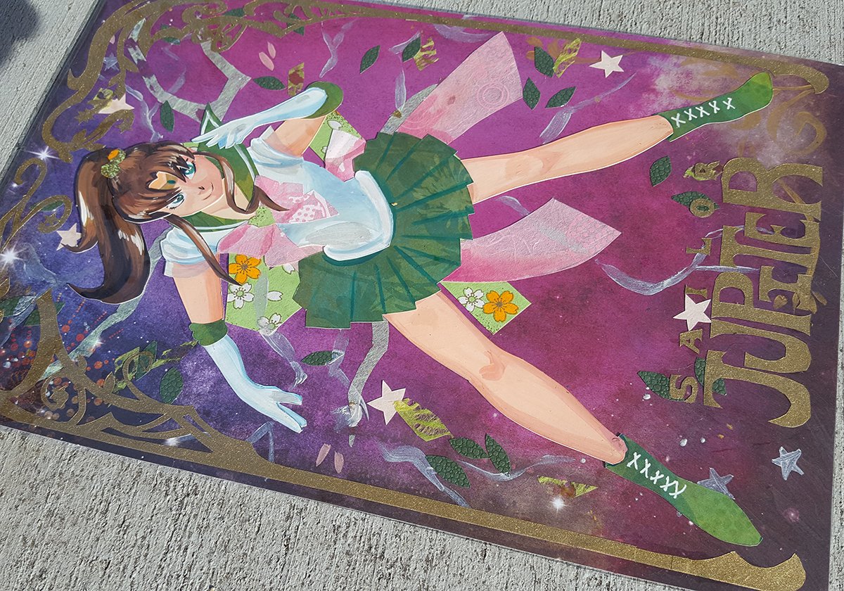 Paper and gouache original of Sailor Jupiter from the Sailor Moon series Measures 8 x 12 inches and features metallic and glitter papers.