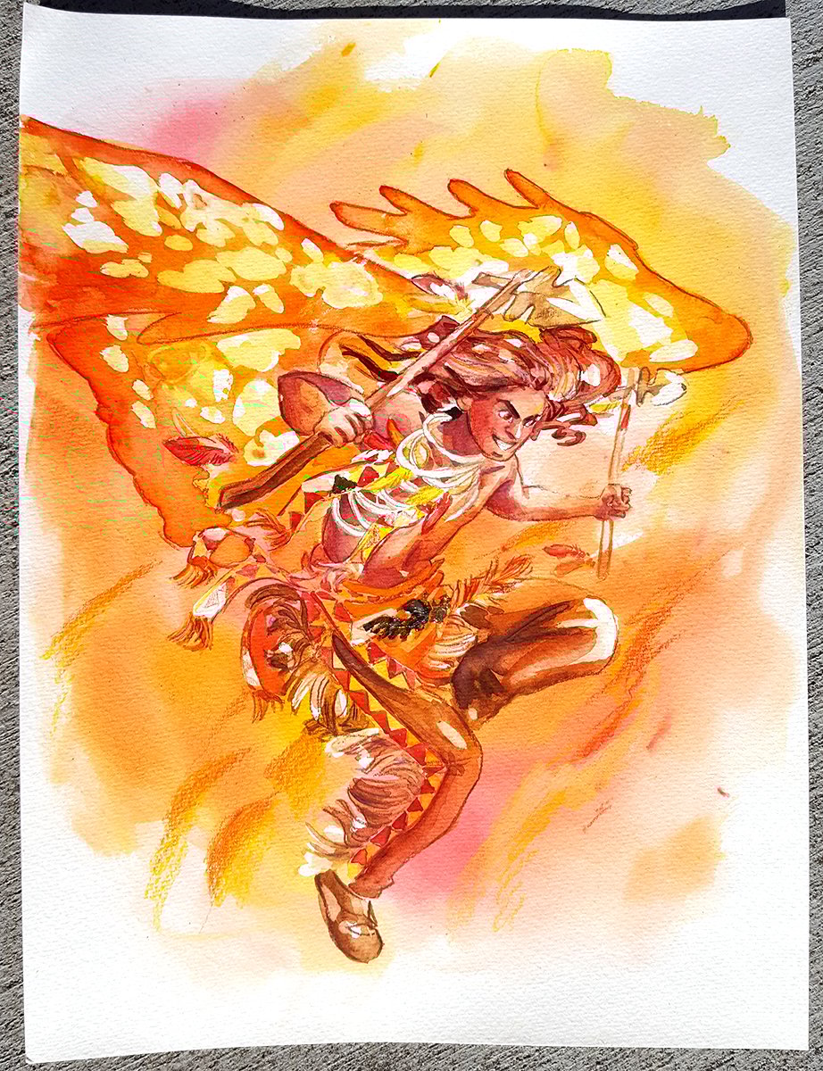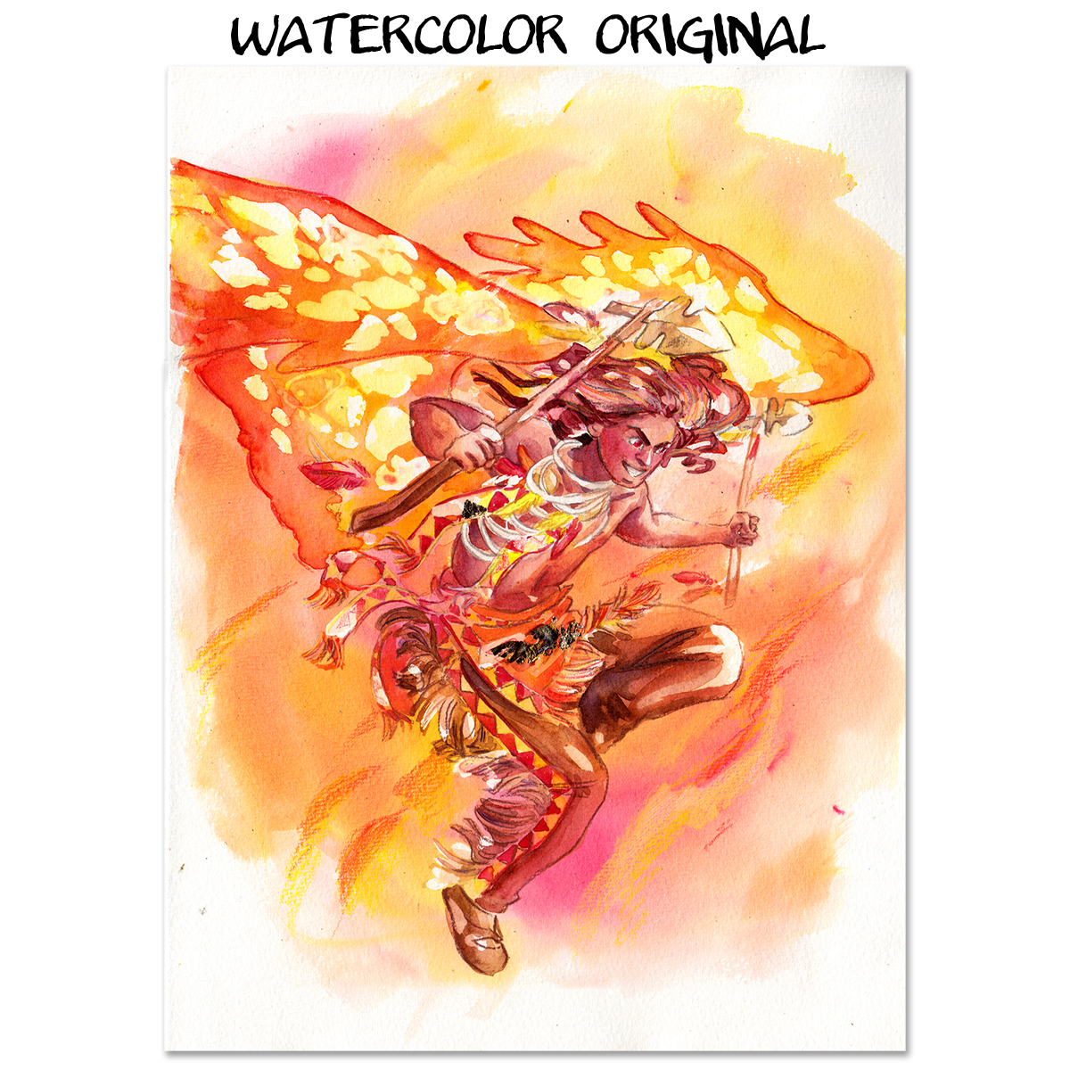 Watercolor original of Moltres as a human. Measures 9x12" and features gold foil accents.