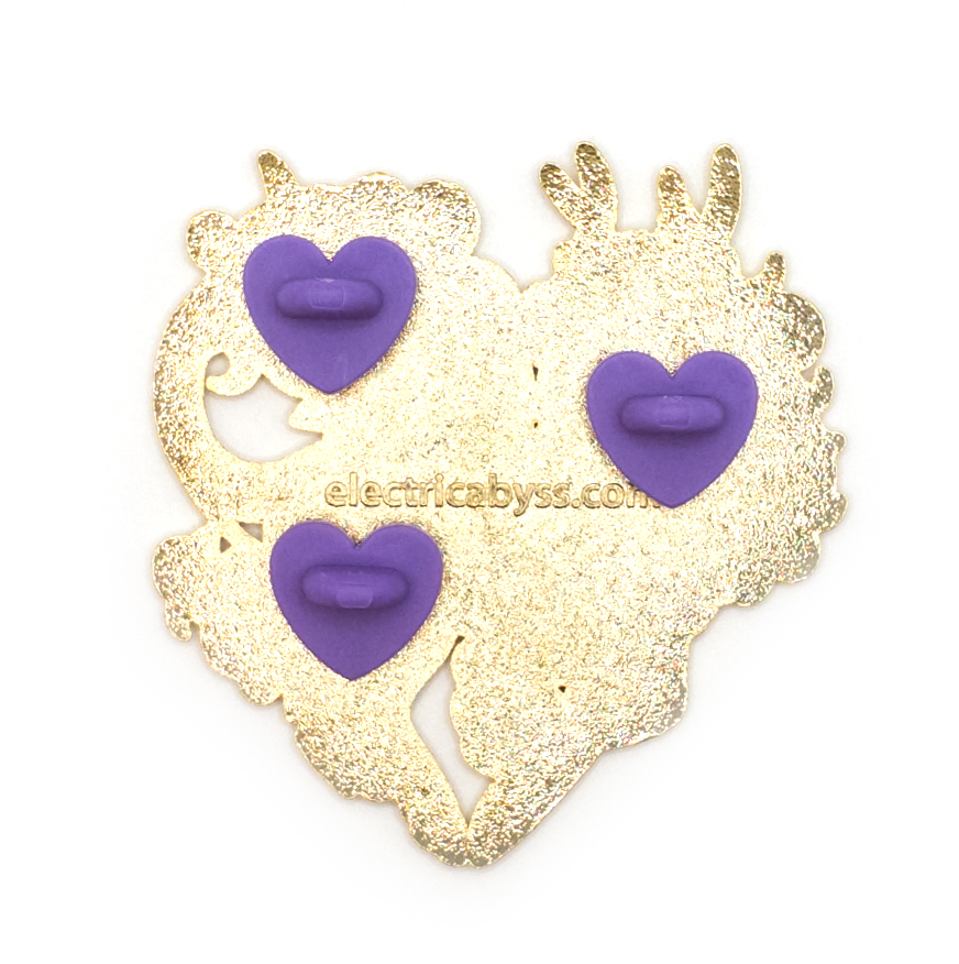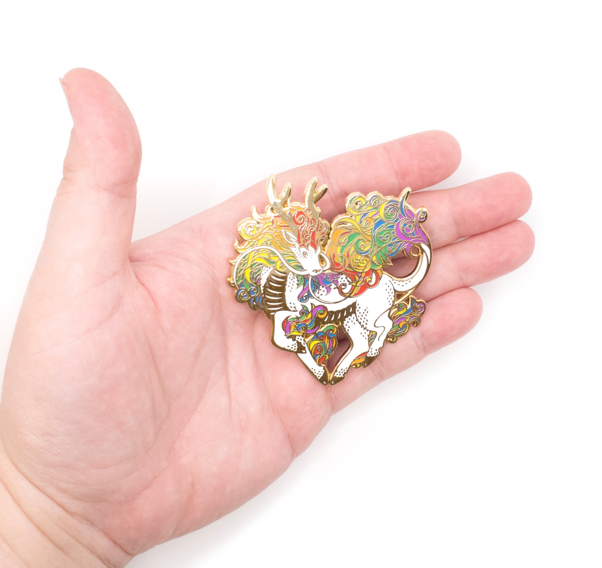 2.5" hard enamel pin featuring a heart-shaped kirin in pride colors.