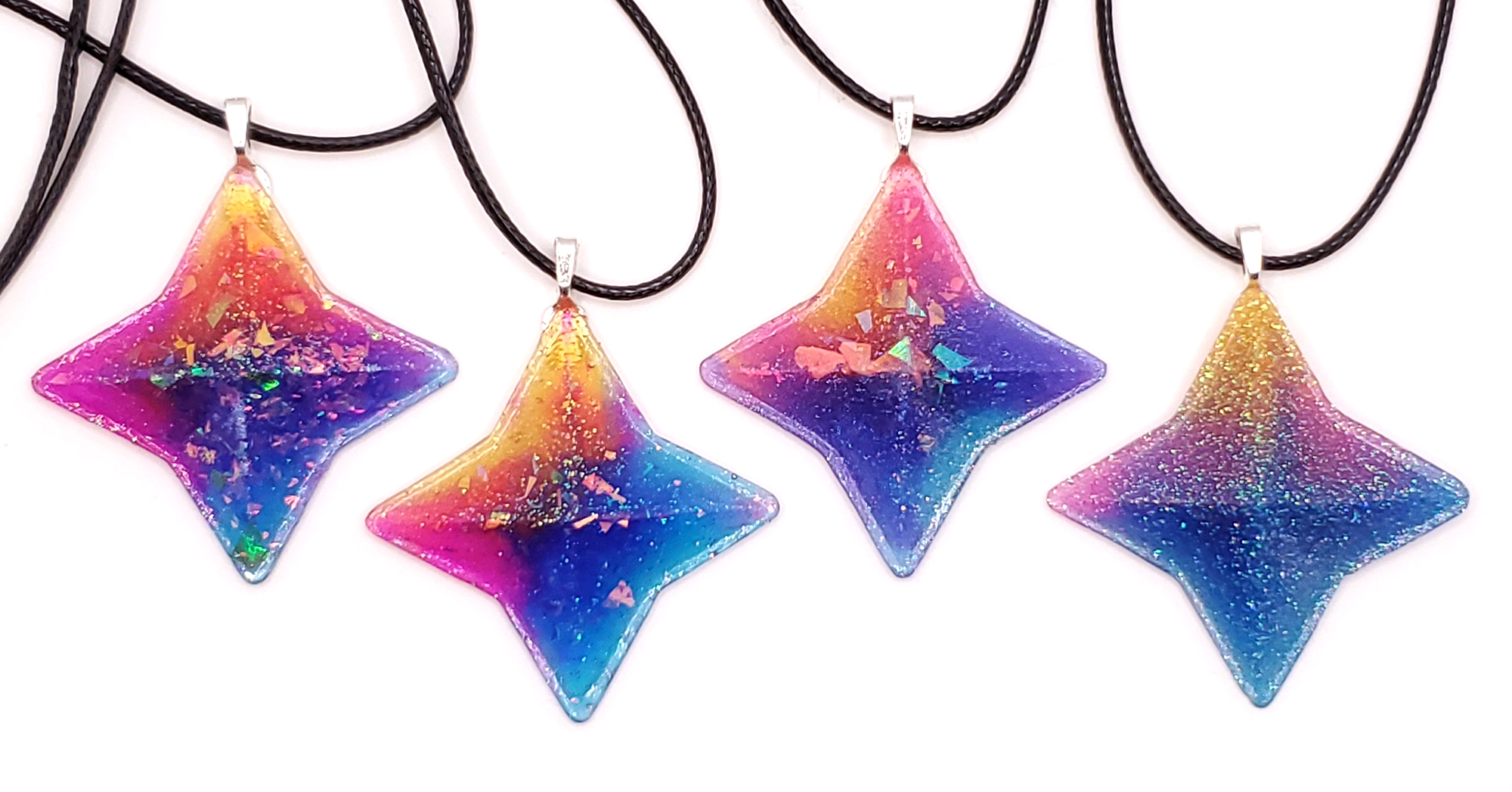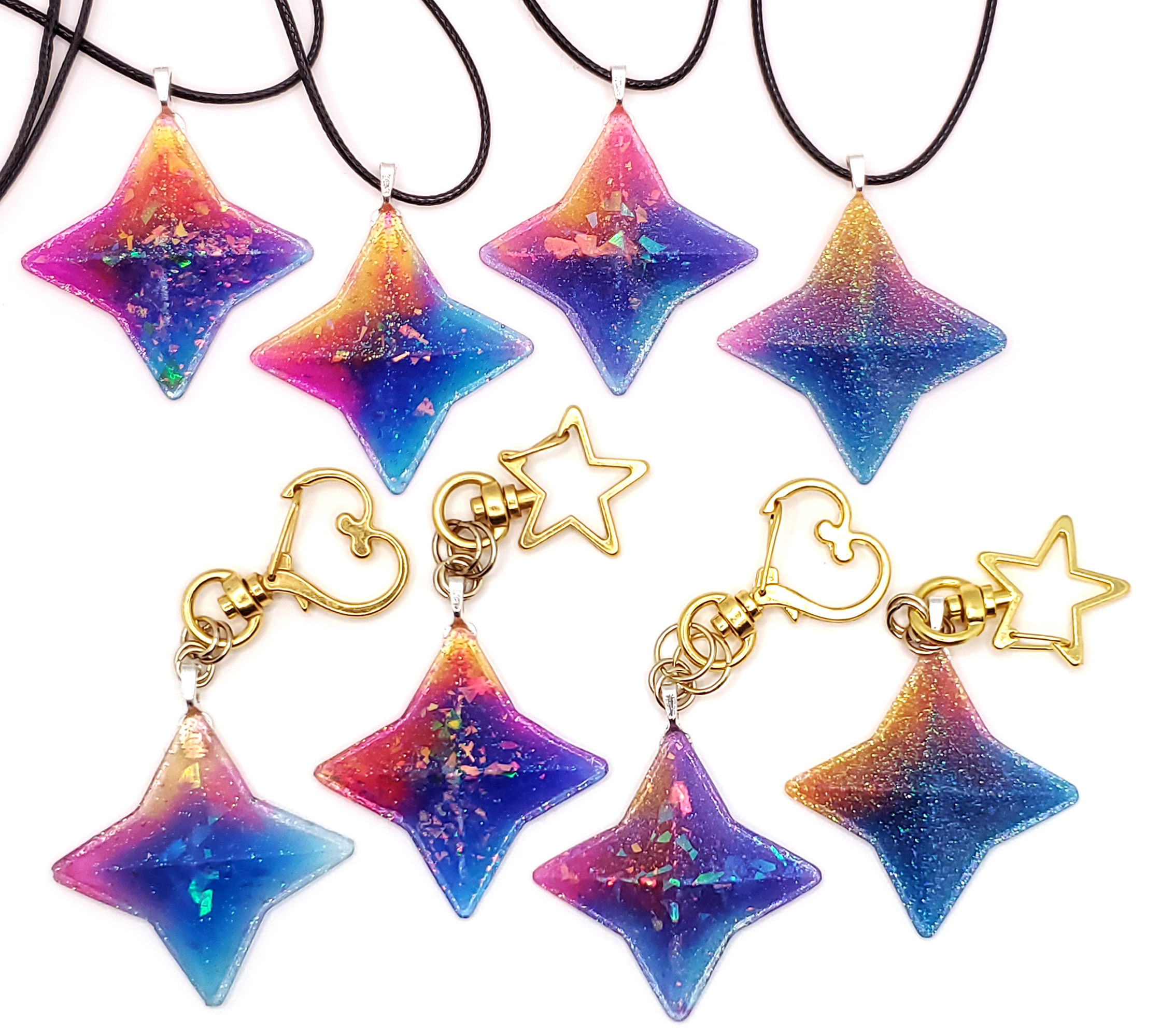 Feel lucky with your very own starlit primogem! These transparent resin stars are full of opalescent flakes and iridescent glitters, making them shimmer and sparkle in the light. Available as either a necklace or a keychain.