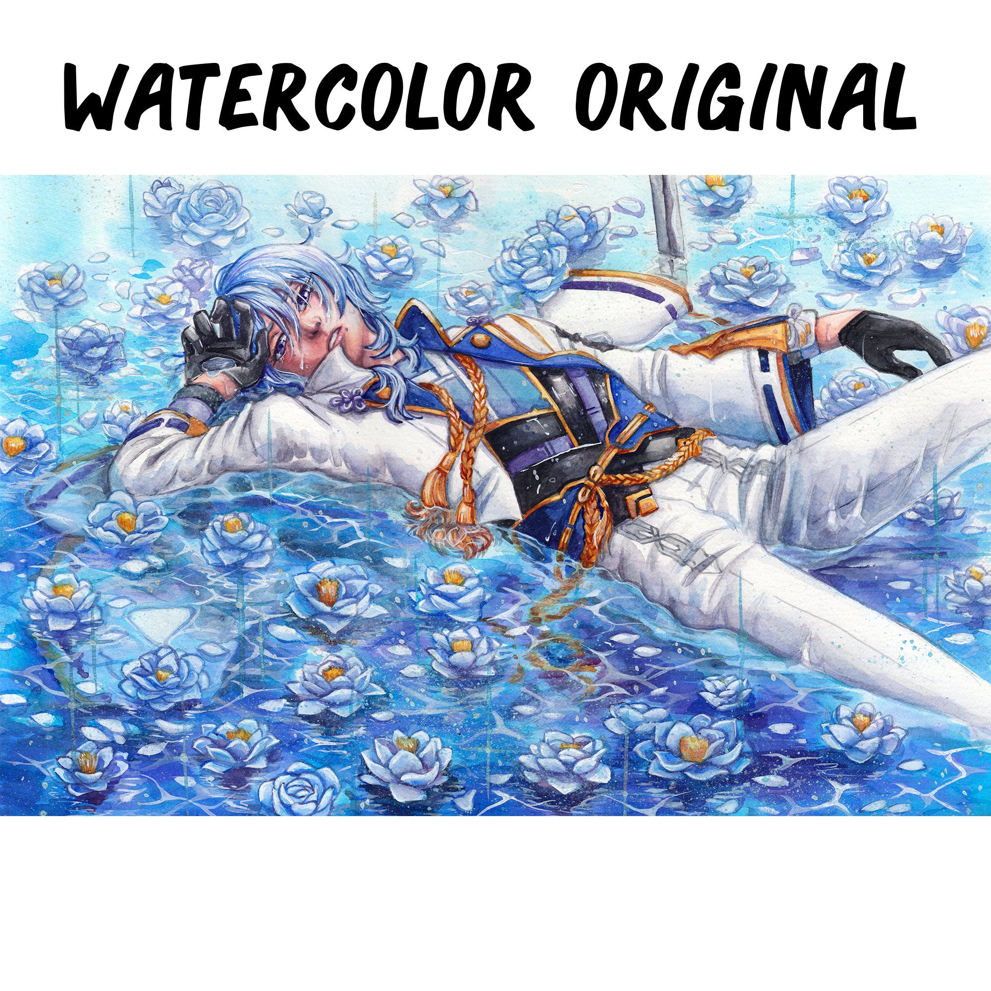 Own the original watercolor painting of Ayato in his tsubaki field. Painting measures approximately 16x10.5" on 16x12" watercolor paper and features shimmering highlights.