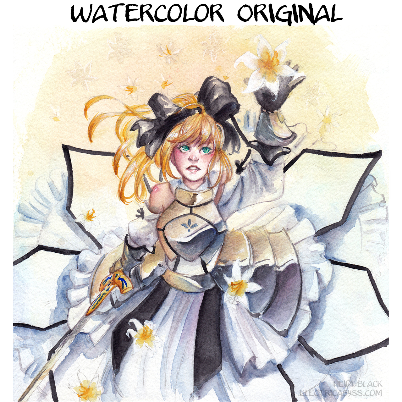 Original watercolor painting of Lily Saber from the Fate series. Measures 8" x 8" and features shimmering and iridescent paints