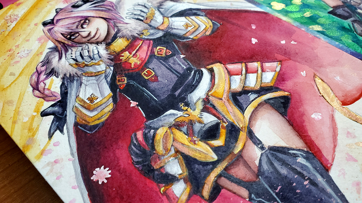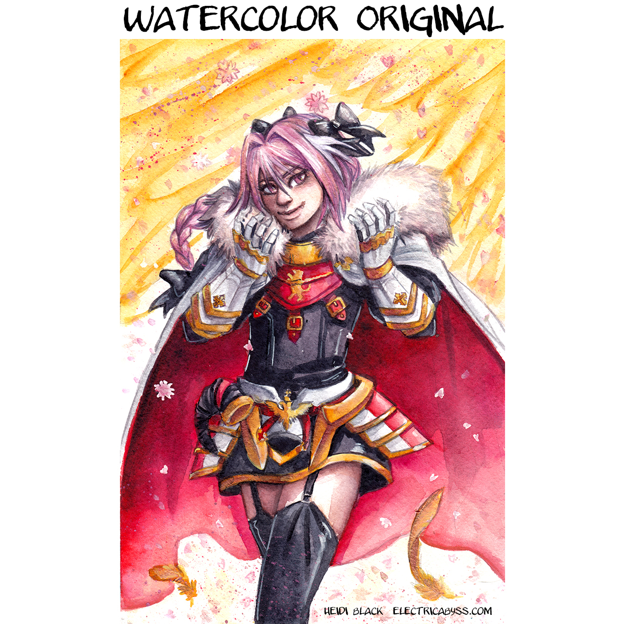 Original watercolor painting of Astolfo (Rider of Black) from the Fate series. Measures 6" x 9" and features shimmering and iridescent paints
