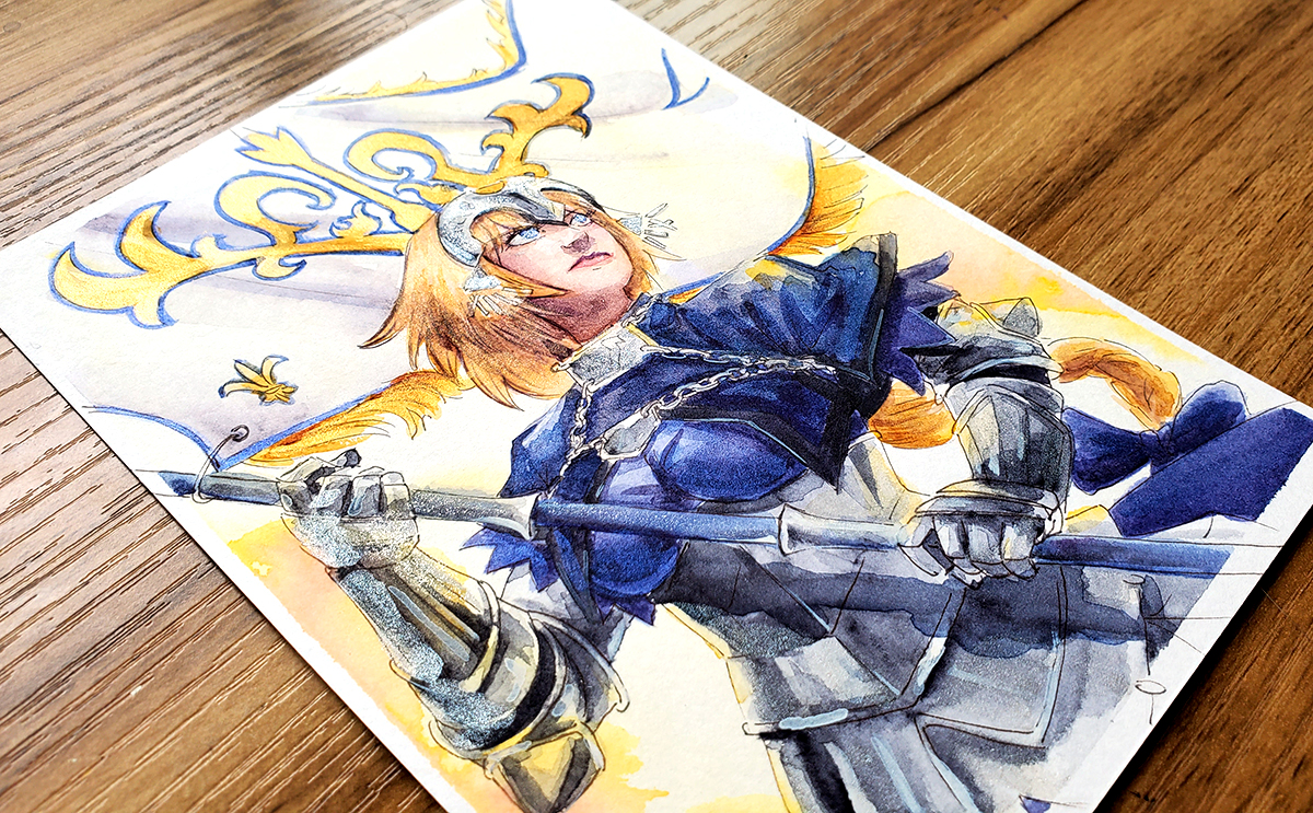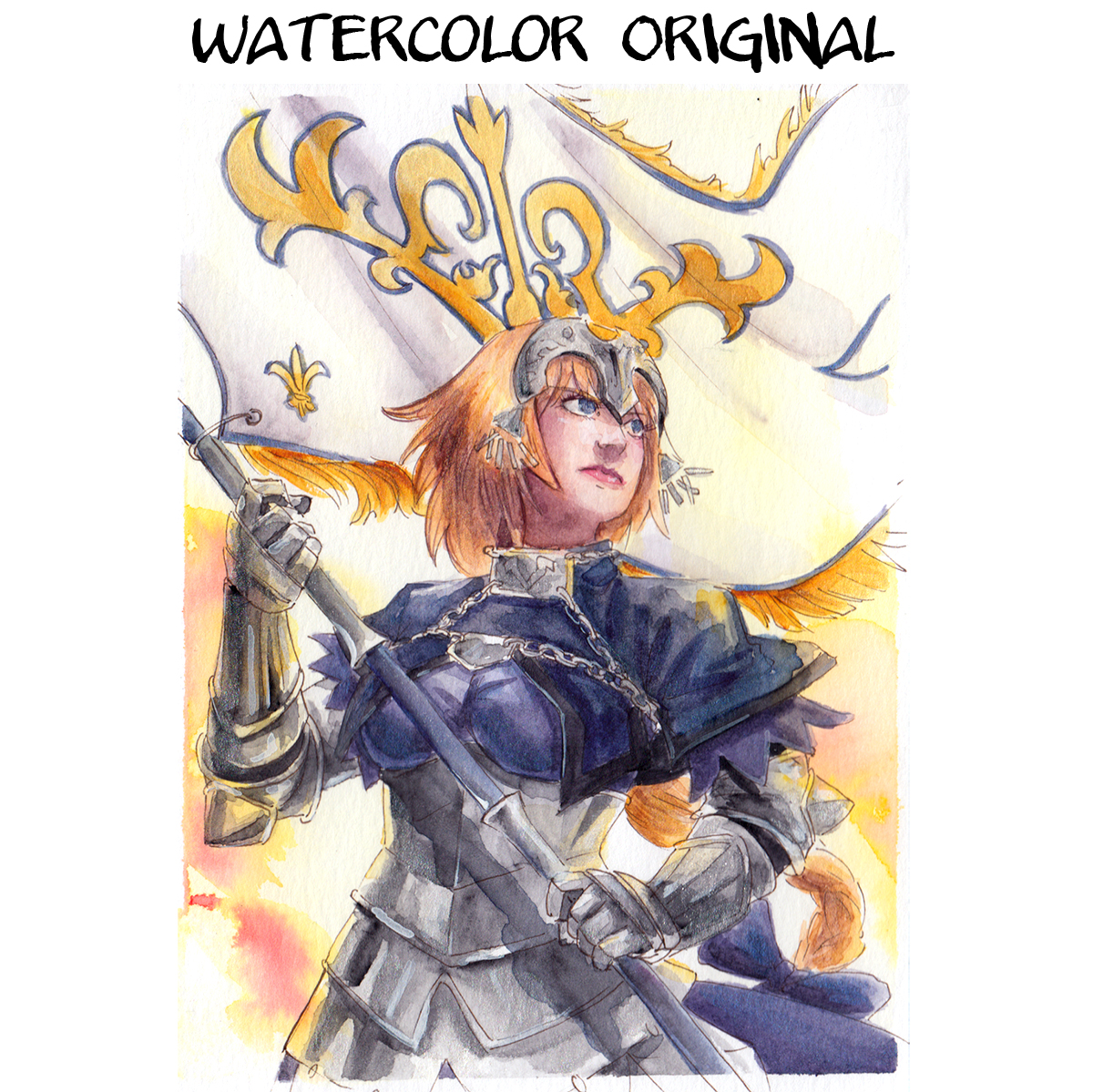 Original watercolor painting of Jeanne d'Arc (Ruler) from the Fate series. Measures 4.65" x 6.5" and features shimmering and iridescent paints.
