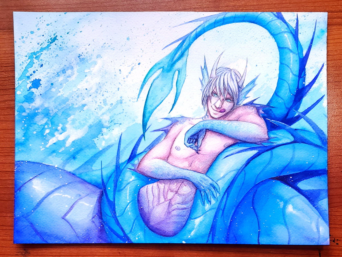 Watercolor painting of a sea serpent merman for a "draw this in your style" challenge. Original measures 9 x 12 inches and is on Arches watercolor paper.