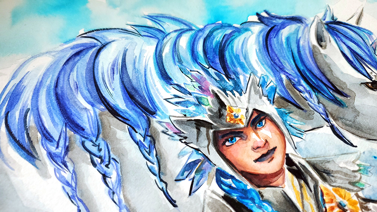 Watercolor painting of an icy valkyrie and her steed. Measures 12x16 inches.