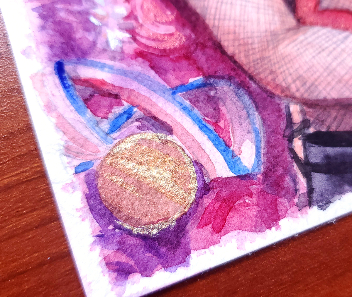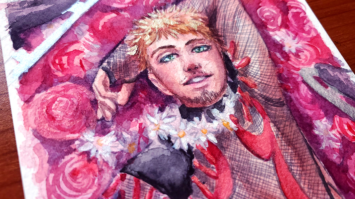 Watercolor painting of Christophe Giacometti from the series Yuri on Ice. Measures approximately 5 x 6 inches and features metallic paints.