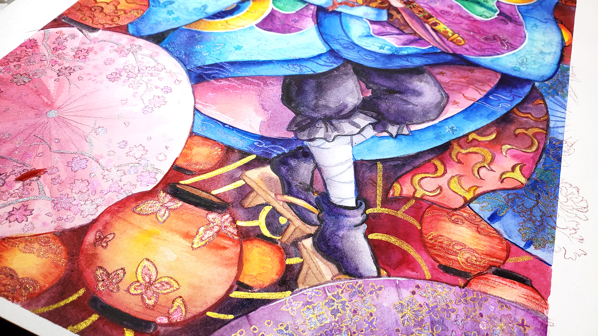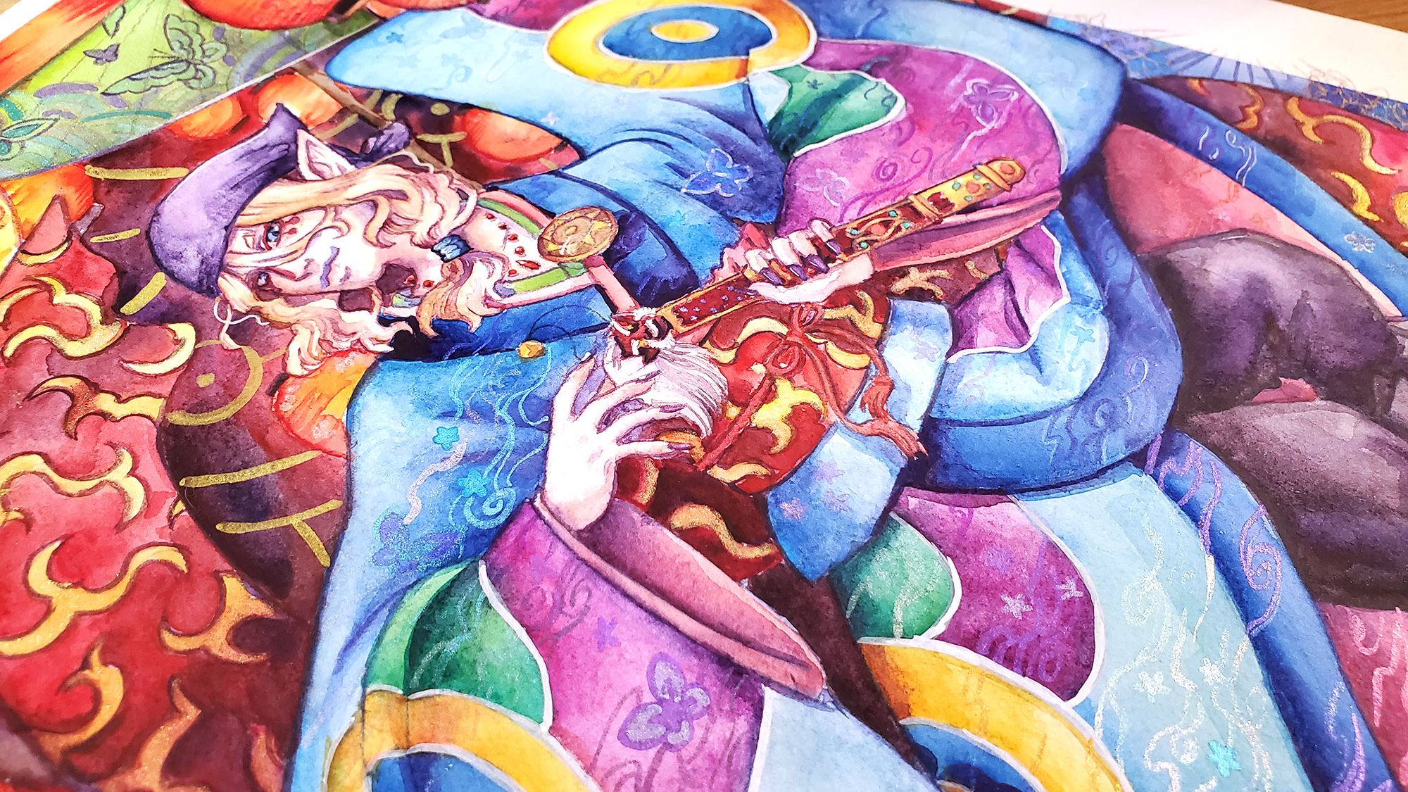 Original watercolor painting of the medicine seller from mononoke with color-shifting and shimmering watercolors. Measures 12x16", painted area measures 10.25x15.75"